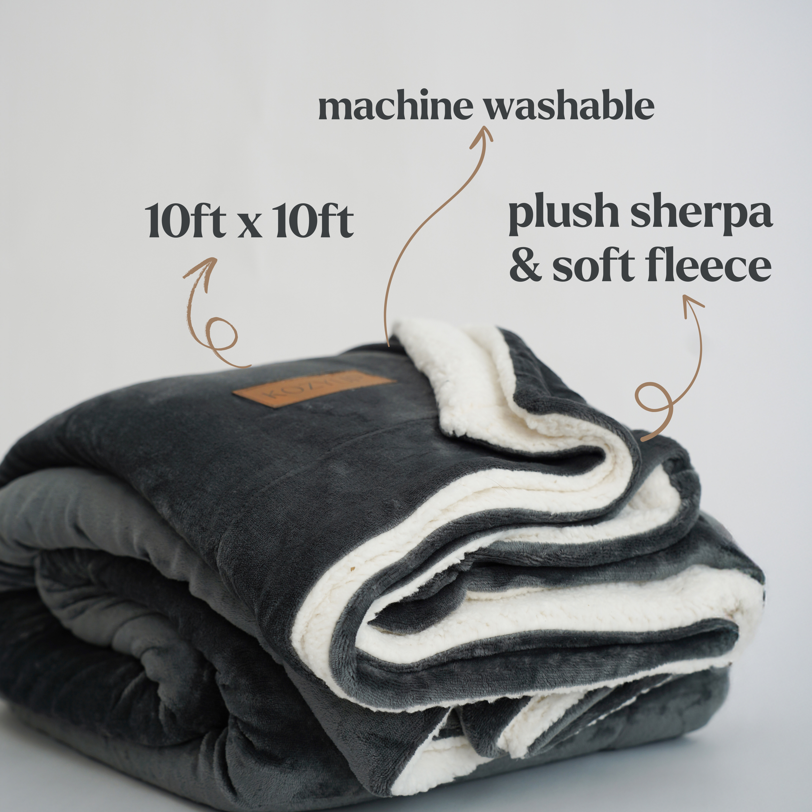 Crafted from ultra-plush, incredibly soft fabric, this double-sided blanket allows for ultimate relaxation. Its oversized frame, at 10ft by 10ft, means theres plenty to go around. It is the perfect companion for family movie nights, cozying up with friends, or relaxing with your favorite person.